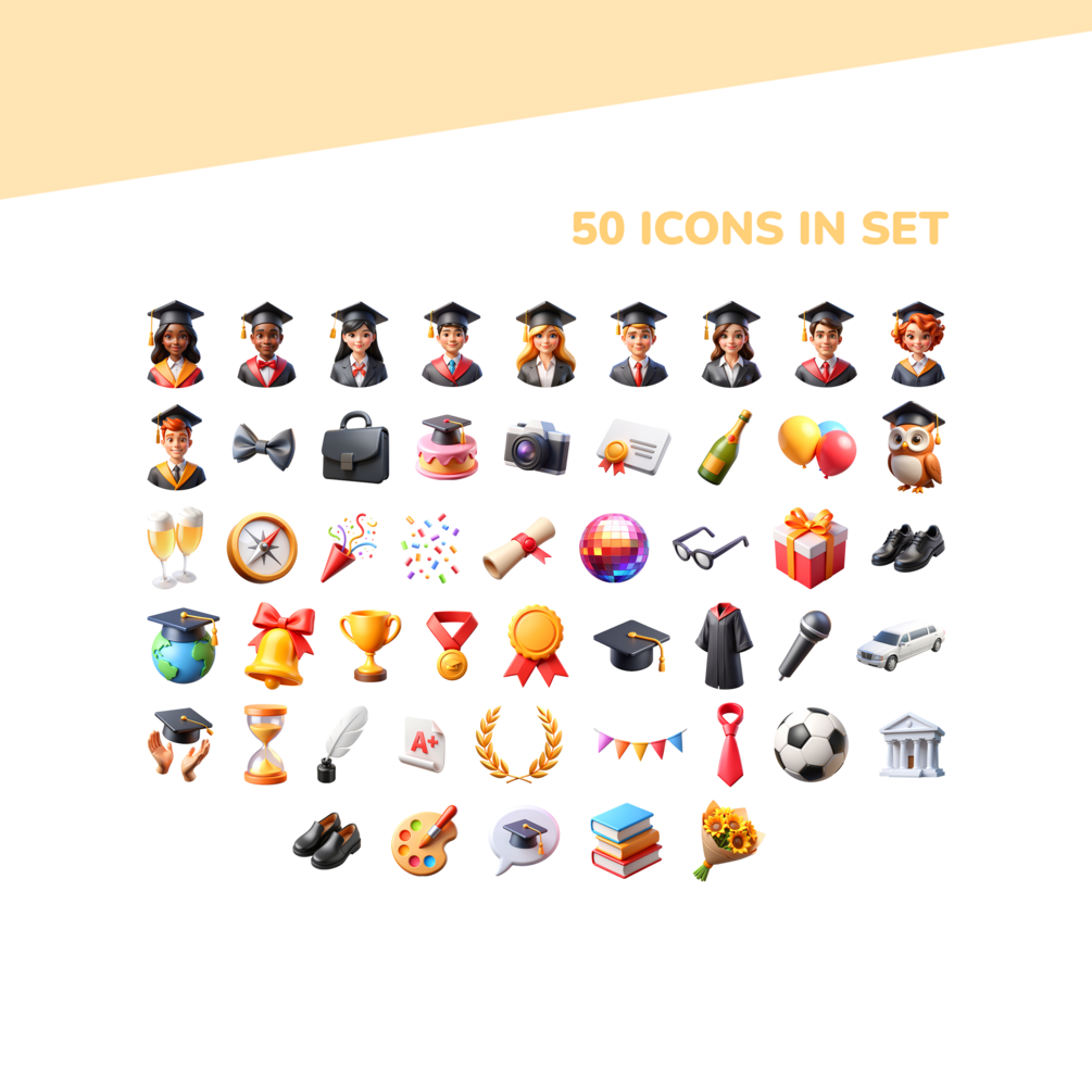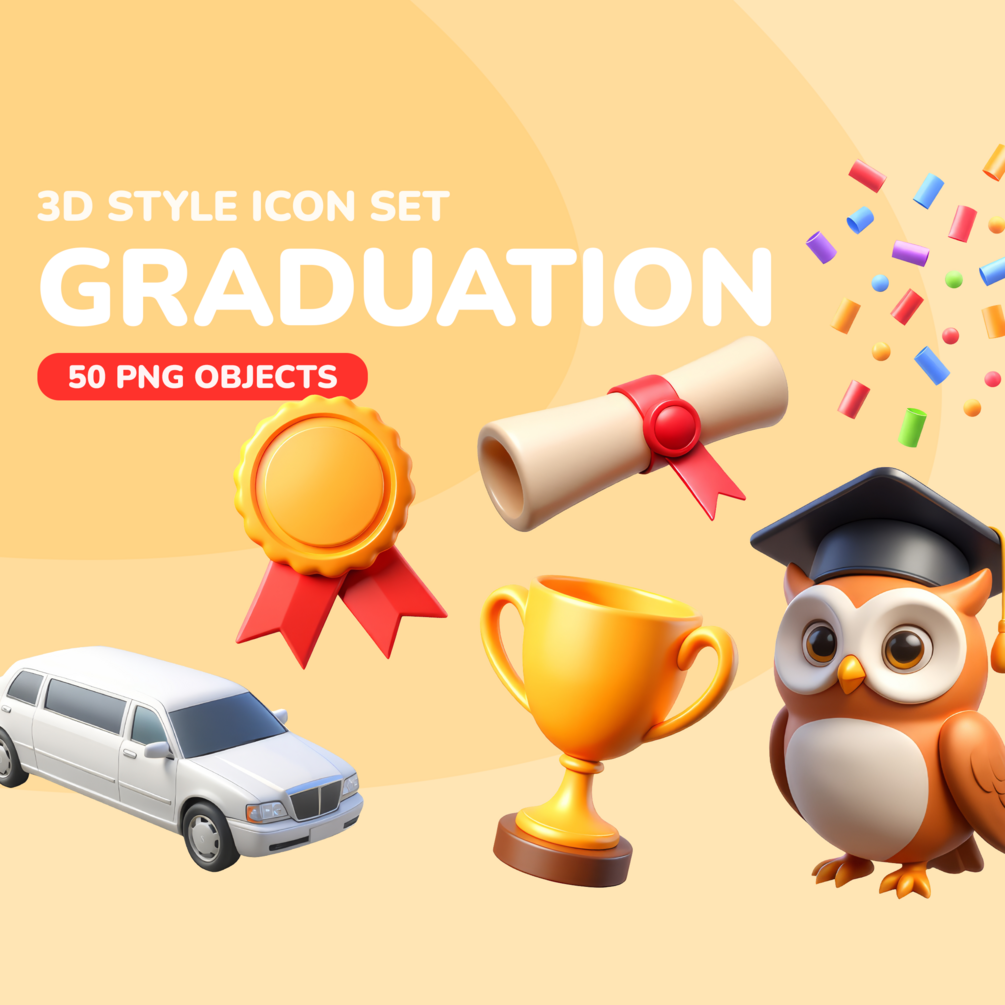 Celebrate achievement and academic spirit with this rich set of 50 3D icons. From graduates and diplomas to trophies, books, and party elements — perfect for school websites, event invites, social media, presentations, and more. Ideal for bringing education-themed projects to life!